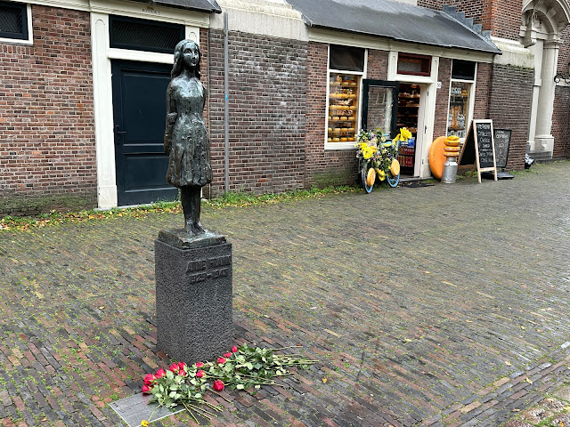 A simple statue of Anne Frank is not far from her house and the museum built around her legend.