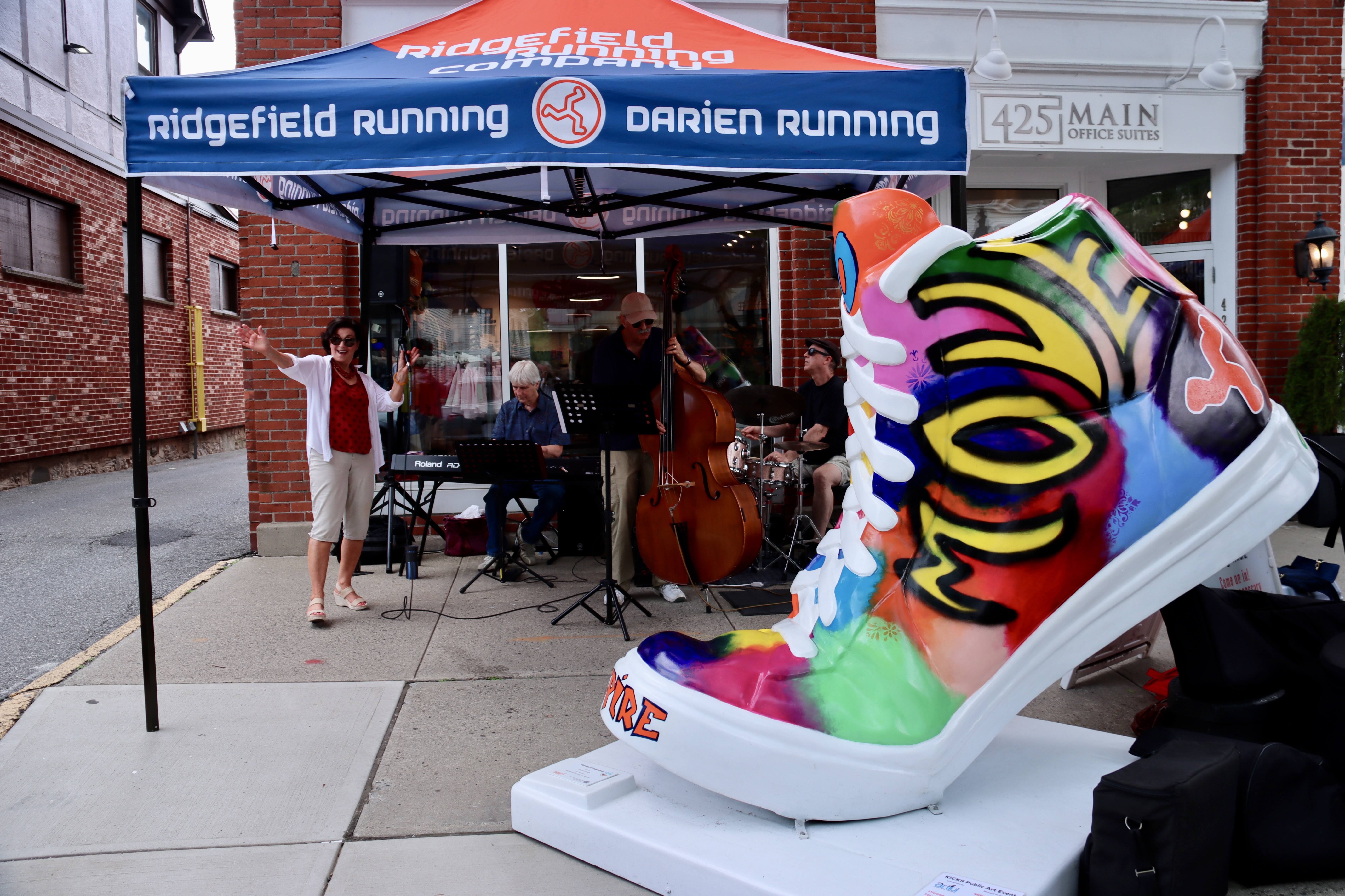 Remember the painted sneakers lining Ridgefield's Main Street this summer? Here is one in front of CVS, painted in the orange-and-black stripes of Ridgefield High School's Tigers. Across the Tiger paw insignia, the sneaker bears the name Steve Hergenrother. Hergenrother just graduated from RHS after a stellar running career.
